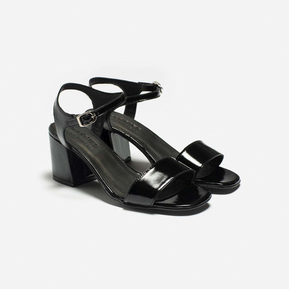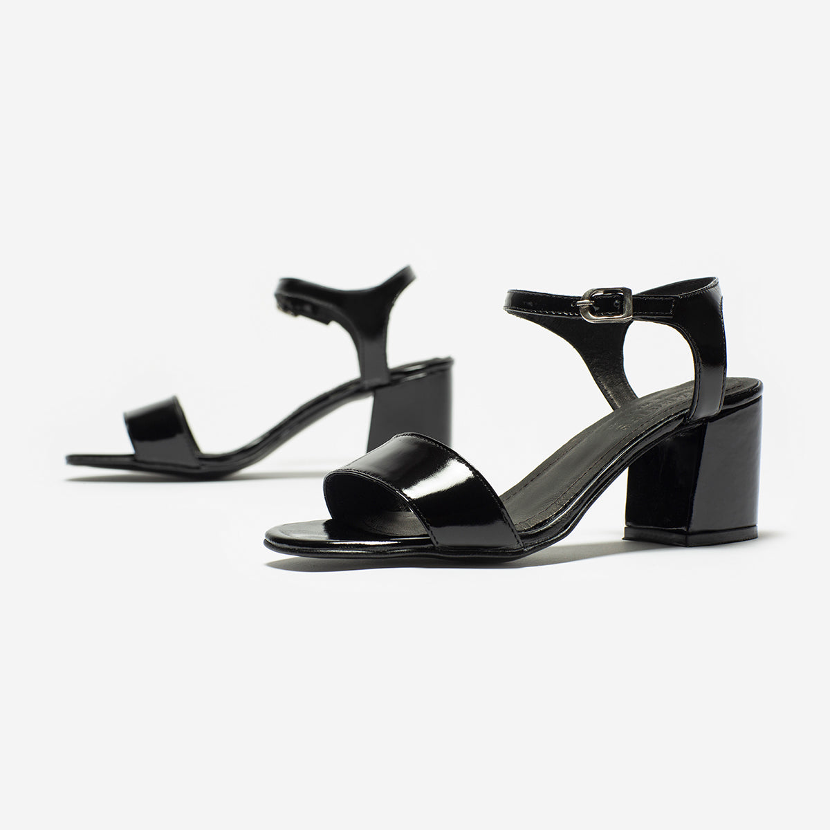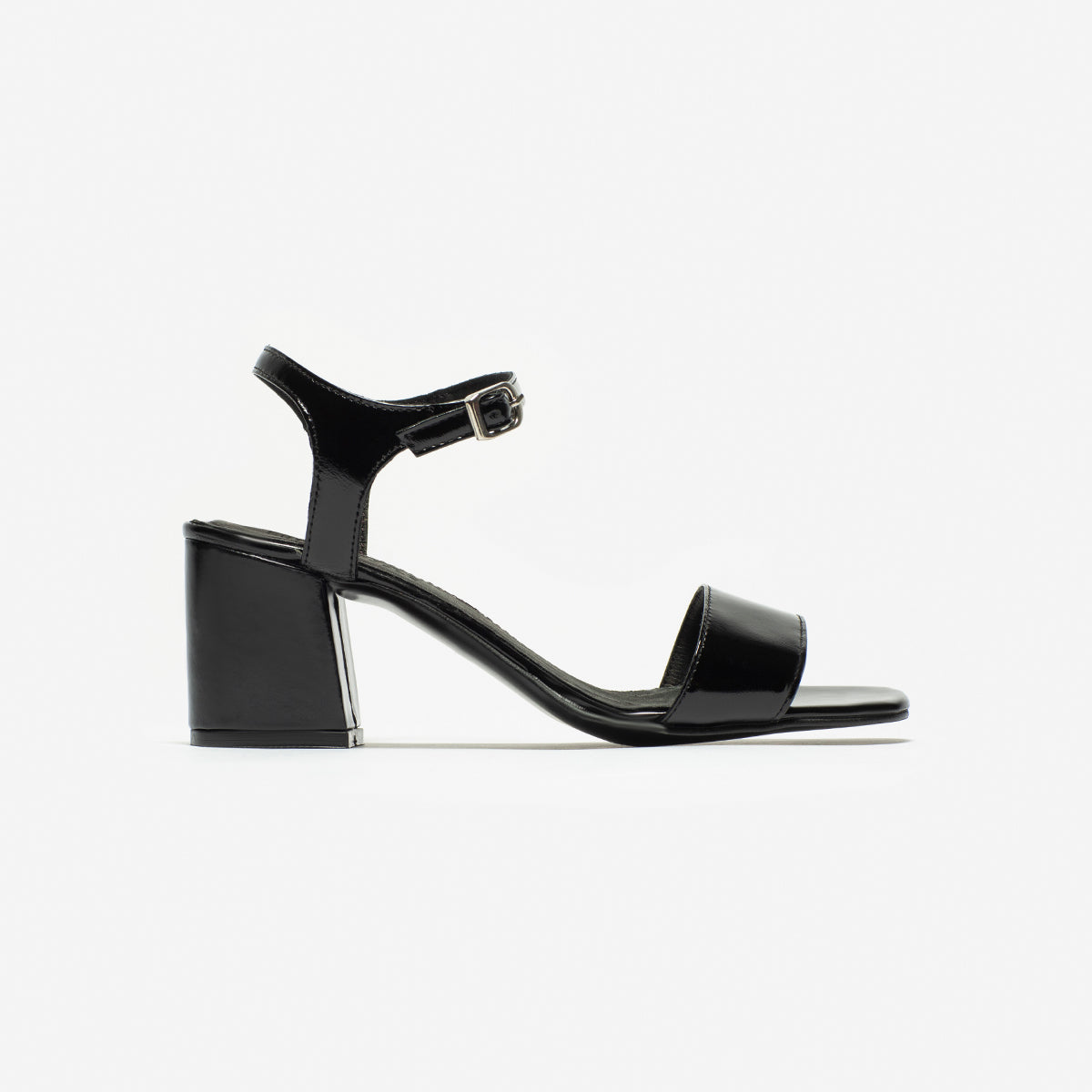 Sandalia Kimi charol negro, interior y plantilla de cuero, base de 7 cm.