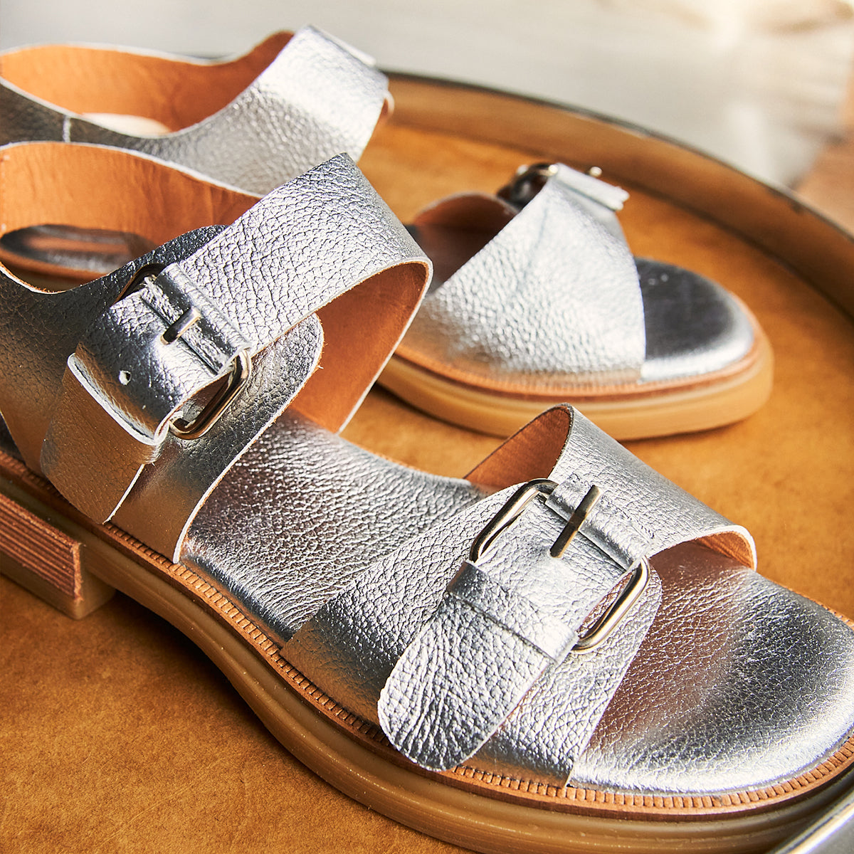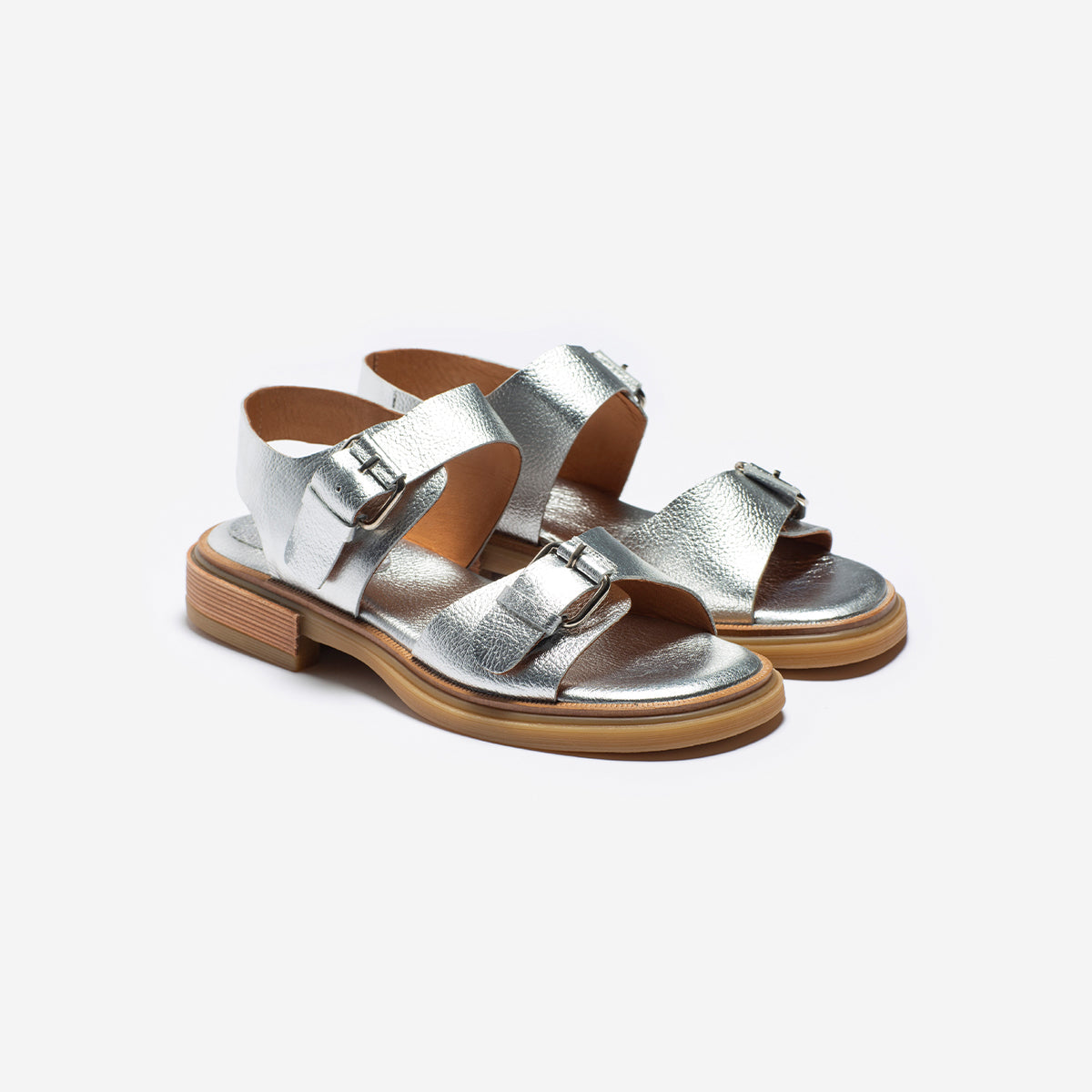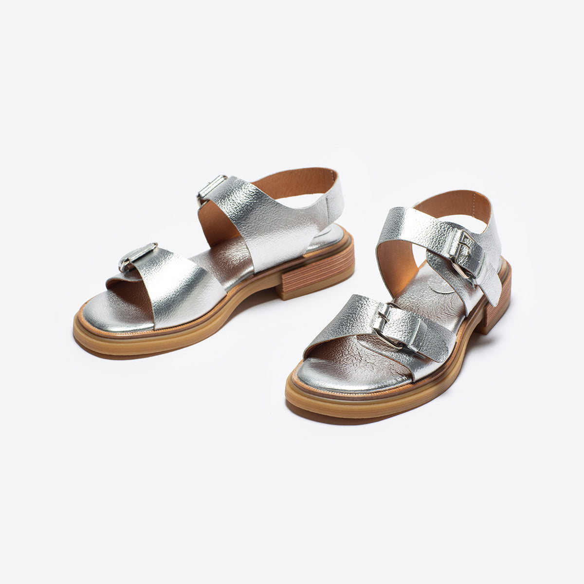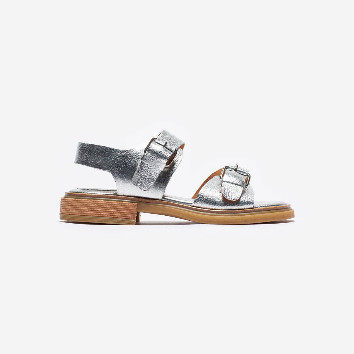 Sandalia Nashi Plata, base 2 cm, interior y plantilla de cuero.